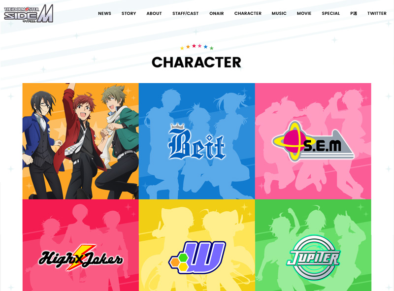 TVアニメ「アイドルマスター SideM」公式サイトを制作しました。 アニメに登場する6ユニットのカラーをちりばめ、細部のアニメーションにもこだわりました。