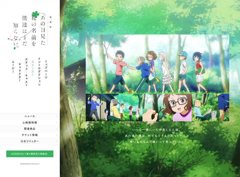 フジテレビ「ノイタミナ」で放送されたTVアニメ「あの日見た花の名前を僕達はまだ知らない。」の劇場版オフィシャルサイトを制作しました。 ノスタルジーを感じるアニメーション演出で、深く作品の世界観を紹介しています。