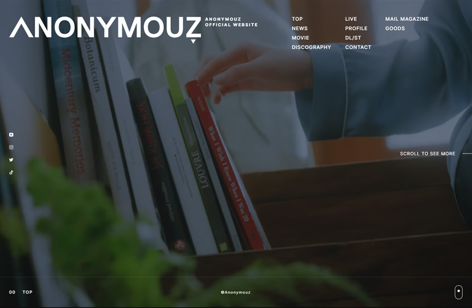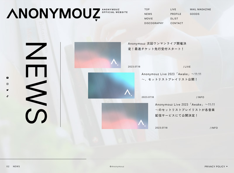 シンガーソングライターAnonymouzさんのオフィシャルサイトをリニューアルさせていただきました。 TOPではビジュアルを活かした横スクロールを採用し、アーティストの雰囲気を伝えています。