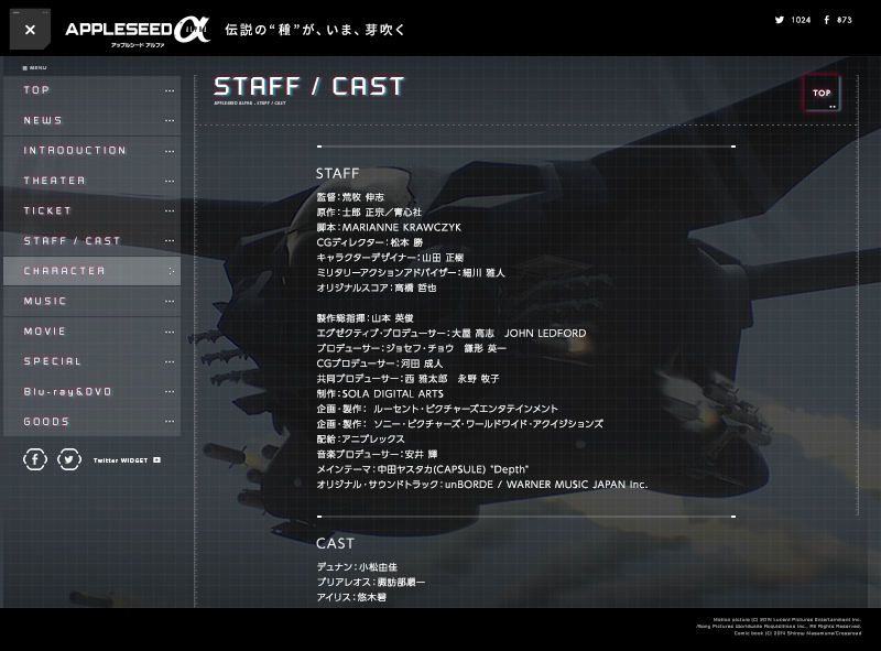 3D CGによって映像化した「アップルシード アルファ(日本版)」オフィシャルサイトを制作しました。 作品の世界観を近未来的なデザインで表現しています。