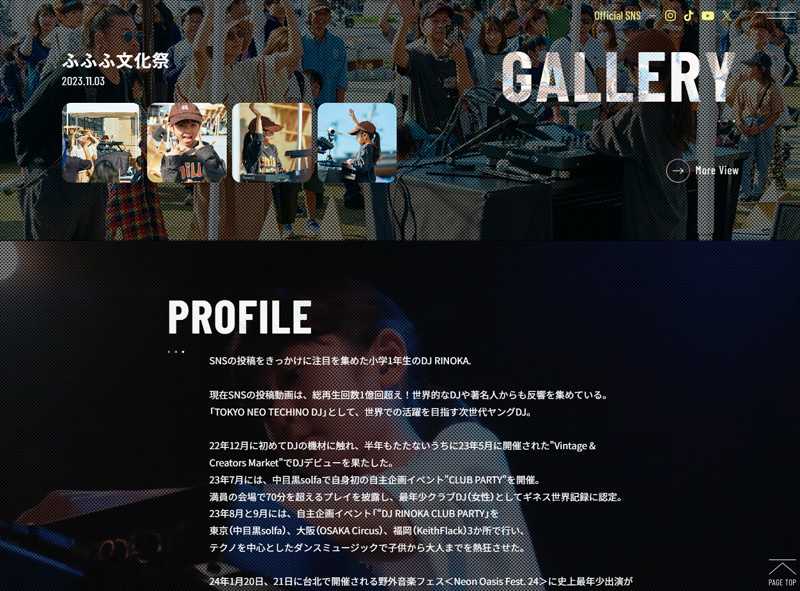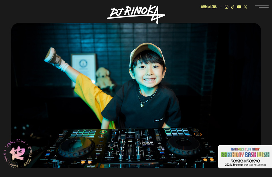 小学生DJ RINOKAのオフィシャルサイトを制作させていただきました。 かわいらしさよりアーティストとしてカッコいい印象を与えられるよう意識したデザインと、 小学生DJというインパクトを伝えられるようDJプレイ中の映像を採用しました。