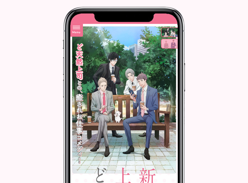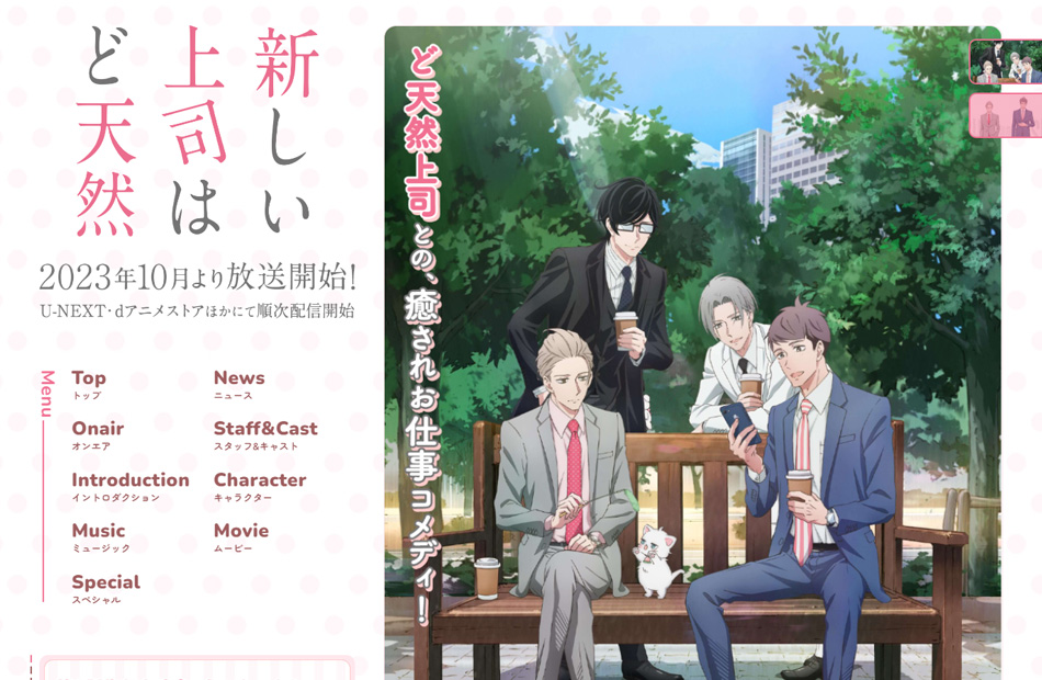 TVアニメ「新しい上司はど天然」公式サイトを制作させていただきました。 作品の素敵な雰囲気を活かせるように白とピンクをベースに可愛く柔らかい印象になるようにまとめました。