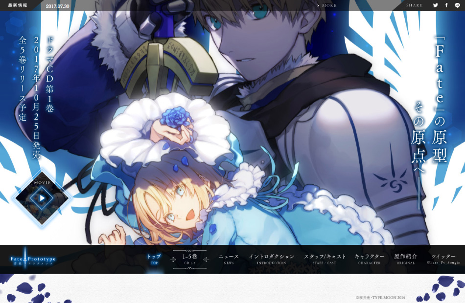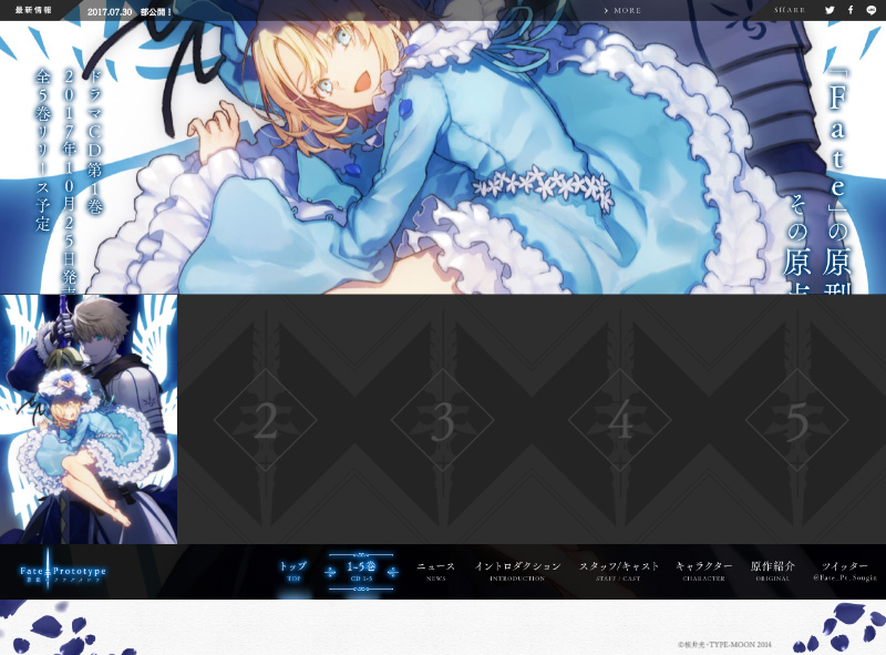 ドラマCD「Fate/Prototype 蒼銀のフラグメンツ」のサイトを作成いたしました。どうしても縦長ビジュアルのエリアは見える範囲が小さくなってしまうため、マウスに合わせて上下に動くようにしております。原作のダークなイメージを意識したデザインです。