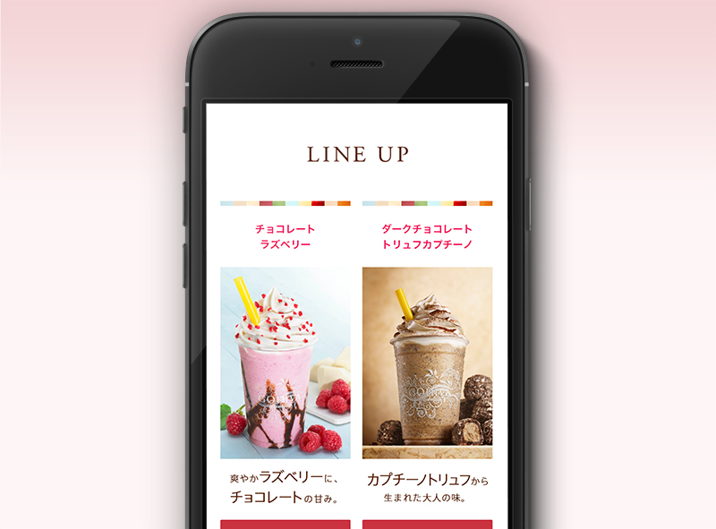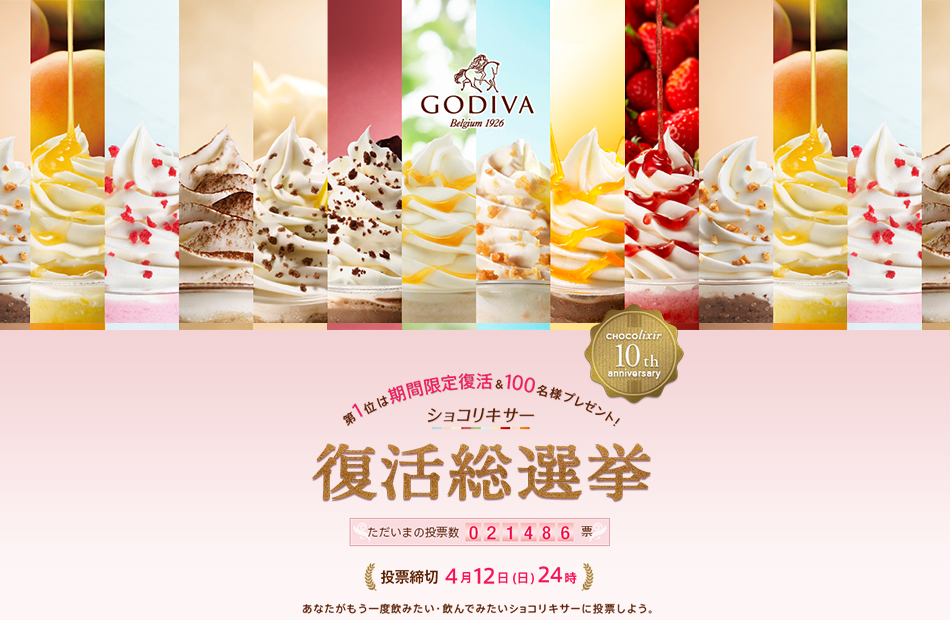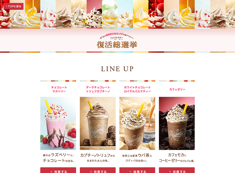 「ショコリキサー復活総選挙」は、過去に発売したフレーバーの中でも人気のあった10種類のショコリキサーから、もう一度飲みたい・飲んでみたいフレーバーに投票し、第1位に輝いたフレーバーを復活販売するというキャンペーンです。そのキャンペーンサイトを制作を担当しました。