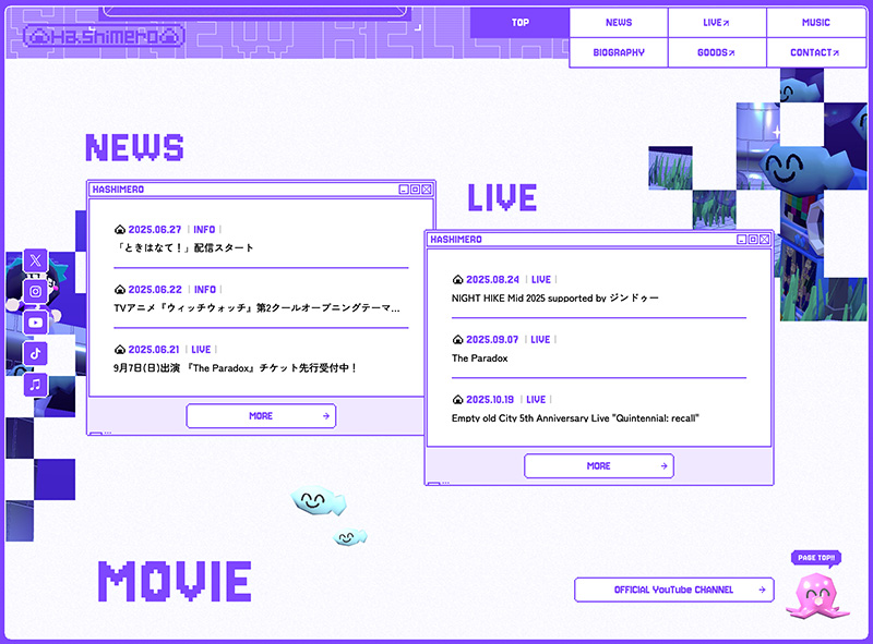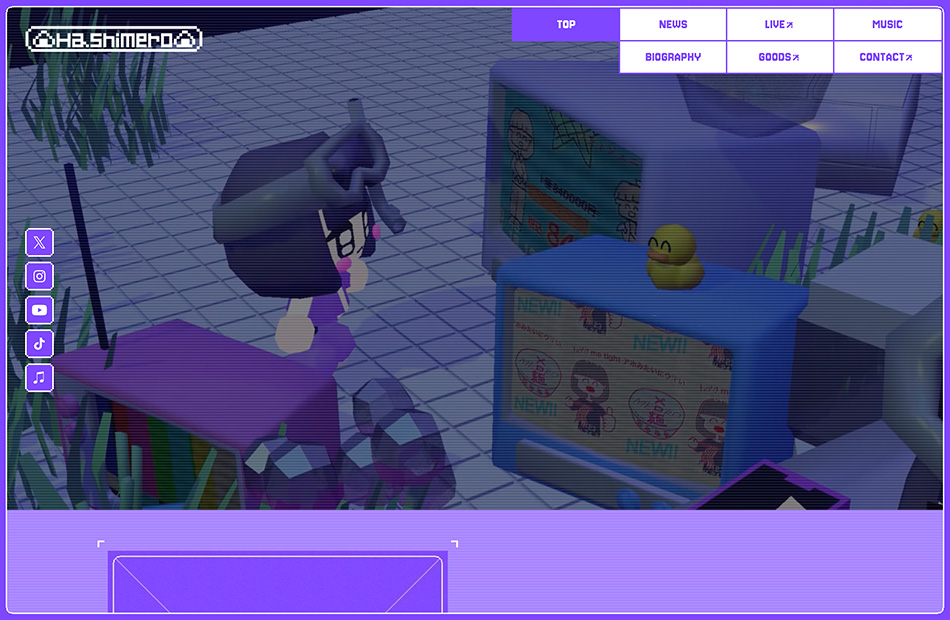 シンガー・トラックメイカーはしメロさんのオフィシャルサイトを制作させていただきました。 3Dビジュアルの世界観に合わせたデザイン/演出を意識して制作しました。