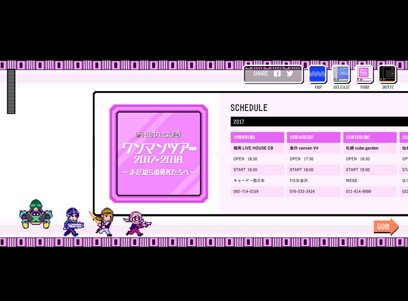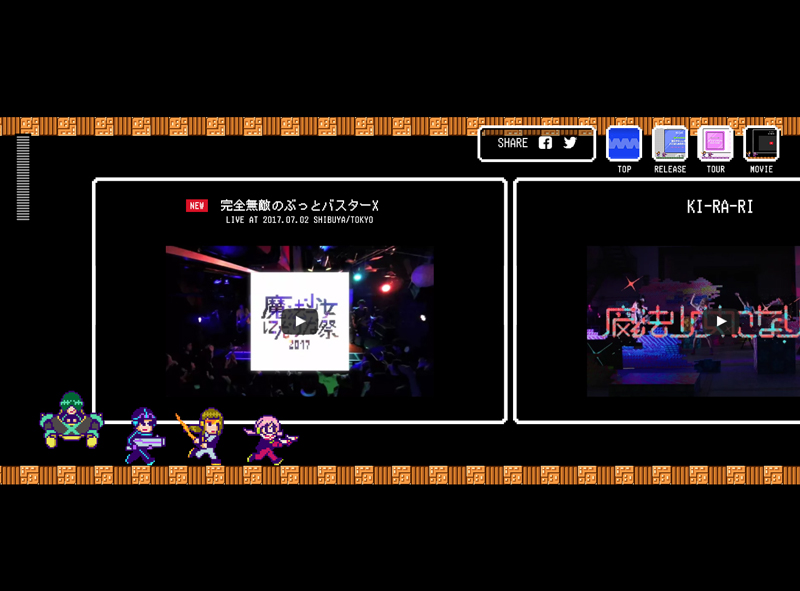 懐かしの8bitな世界観と、キャラクター(メンバー)の動きを最大限に活かすべく、横スクロール(PC)でのWebサイトとなりました。