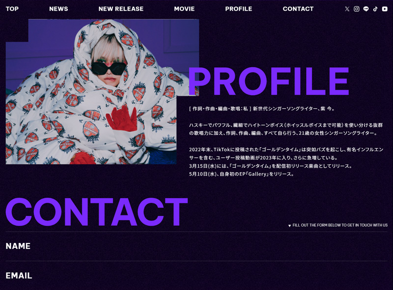 シンガーソングライター「紫 今」オフィシャルサイトを制作させていただきました。 アーティストカラーとコンテンツを全面に展開したデザインで制作しています。