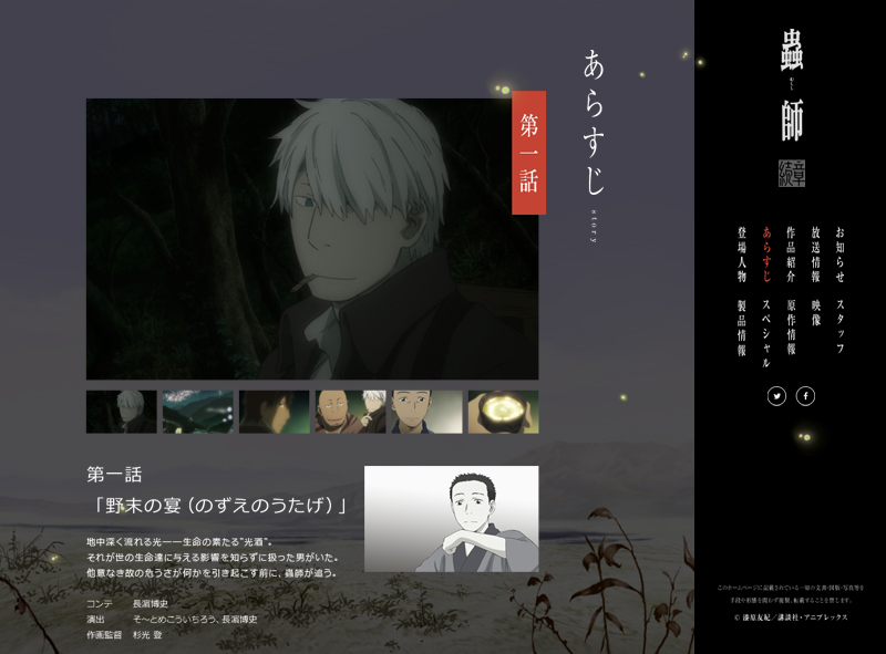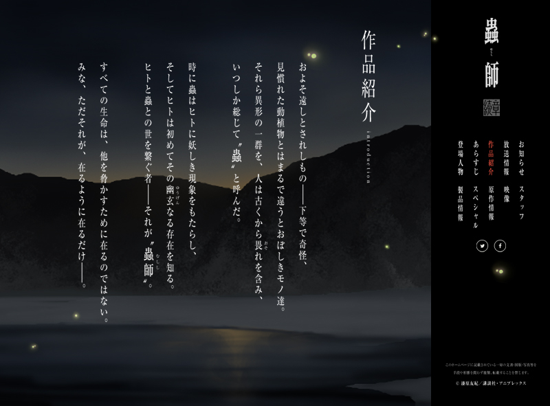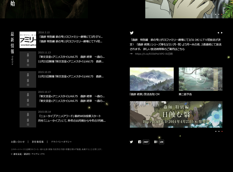 2014年4月からの「蟲師 続章」の放送に合わせ、TVアニメ「蟲師 続章」公式サイトをリニューアルしました。 蟲師の静かで落ち着いた、綺麗な世界観を表現しています。 キービジュアルと美しい背景美術をランダムでスライド表示。画面を飛ぶ「蟲」がポイントです。