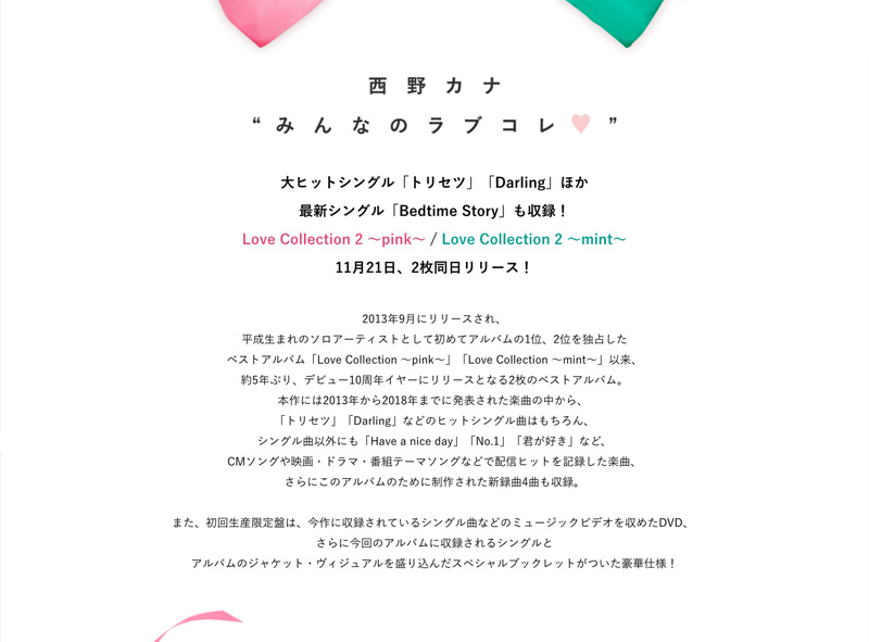 西野カナ Best Album「Love Collection2 ~pink~/~mint~」特設ページ