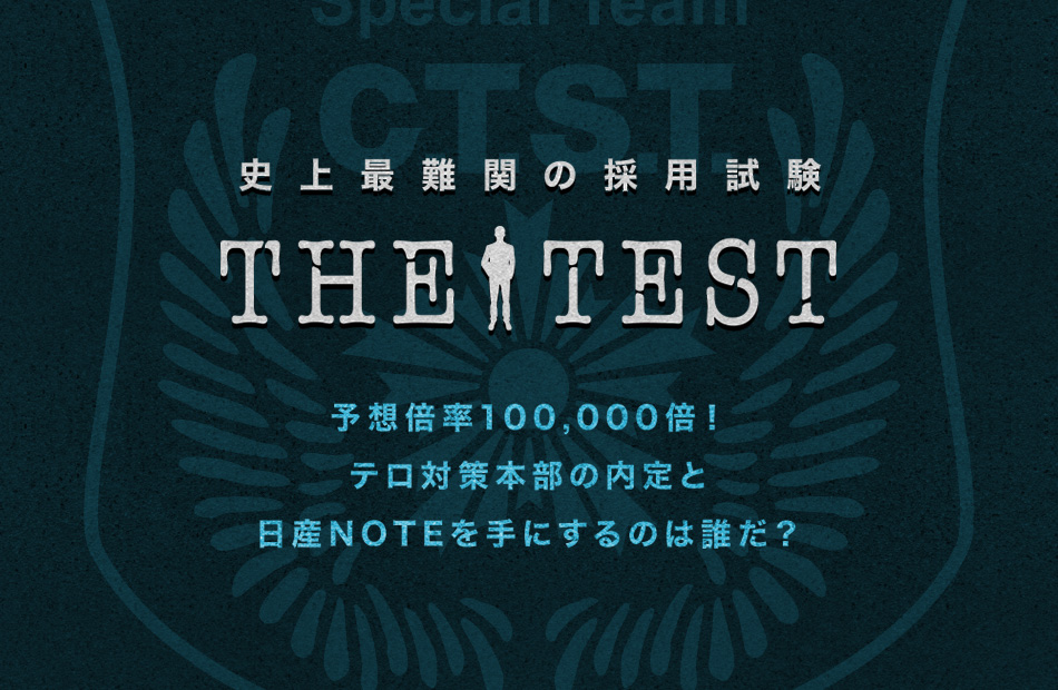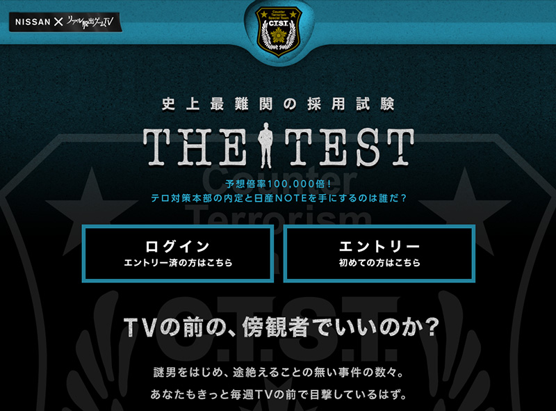 TBSのテレビ番組「リアル脱出ゲームTV」と連動した企画「史上最難関の採用試験 The Test」の特設サイトを制作しました。 毎週のオンエア終了後から開始されるサイトでは、適性診断(ディグラム診断)や筆記テスト、そしてこれまでの同番組史上最高難易度の謎が何週にもわたり出題。この史上最難関と呼べる採用試験「THE TEST」を突破した1名だけが捜査官として番組に出演ができるということで話題をよびました。 「ソーシャルテレビ・アワード 2015」広告賞を受賞。 http://corporate.nikkeibp.co.jp/information/newsrelease/20150721.shtml
