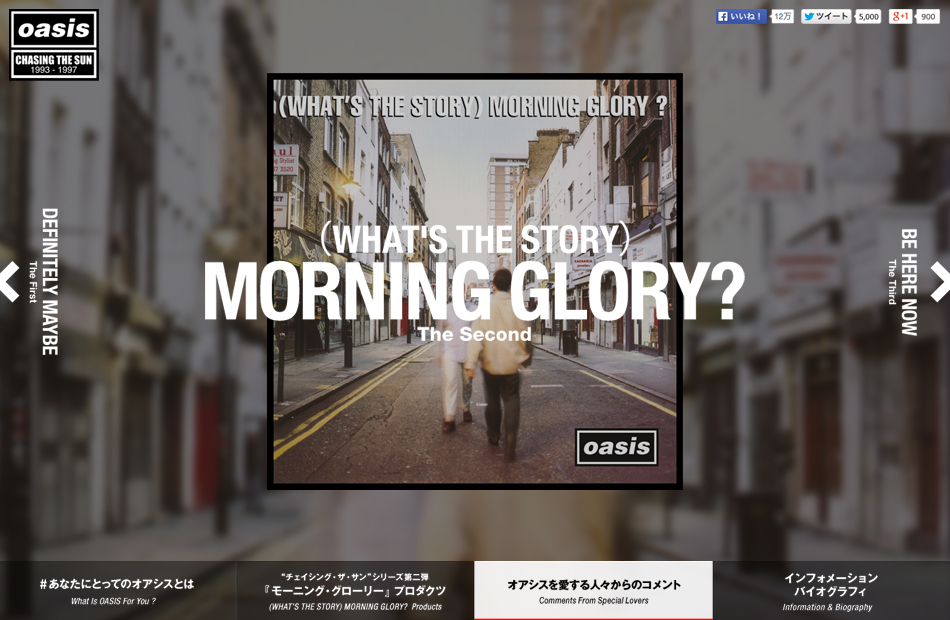 イギリスのロックバンドOASISの20周年記念盤「CHASING THE SUN」の発売にあわせたプロモーションサイトを制作しました。 Twitterと連動したコメント投票では「#あなたにとってのオアシスとは」を題材にトータル投稿数10万コメントを記録。 原宿ラフォーレミュージアムでおこなわれた史上初の展覧会『CHASING THE SUN: OASIS 1993 - 1997』は4日間限定で開催され、国内外から計1万人が来場し大盛況となりました。
