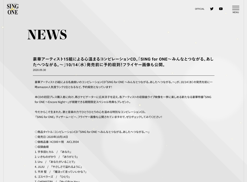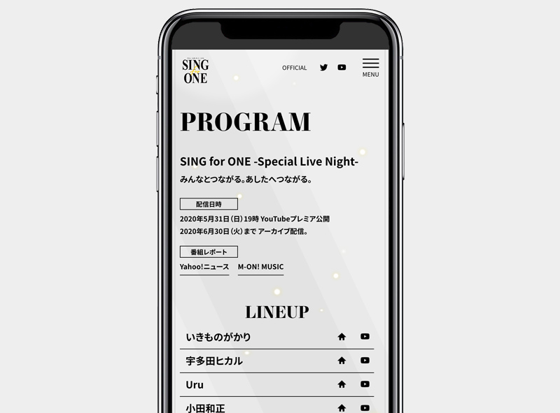 「SING for ONE」のオフィシャルサイトを制作させていただきました。