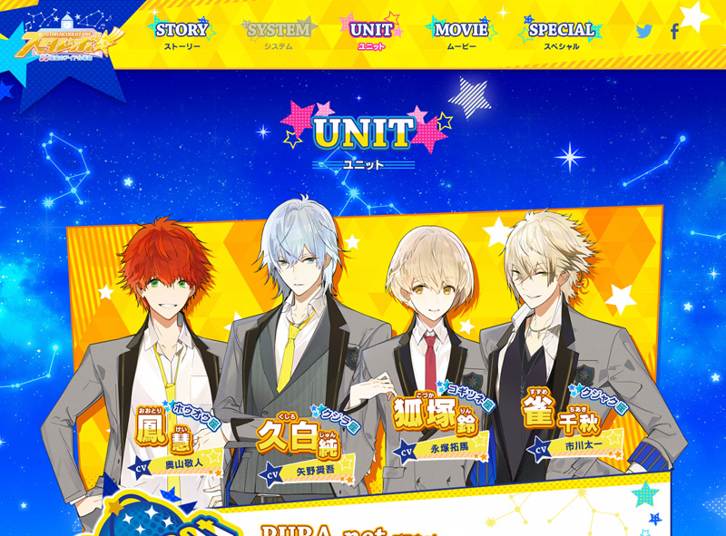 2017年リリース予定のスマホゲーム「スタレボ☆彡 88星座のアイドル革命」のサイトを制作いたしました。 ゲームのテーマである星や星座を散りばめ、キラキラ満載にデザインしています。