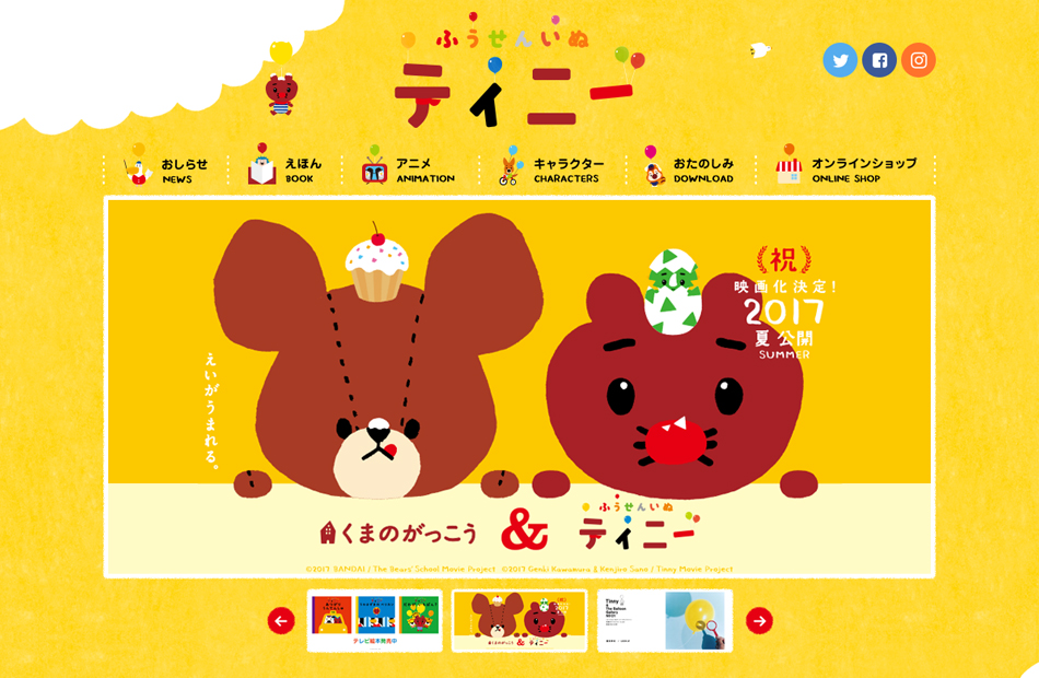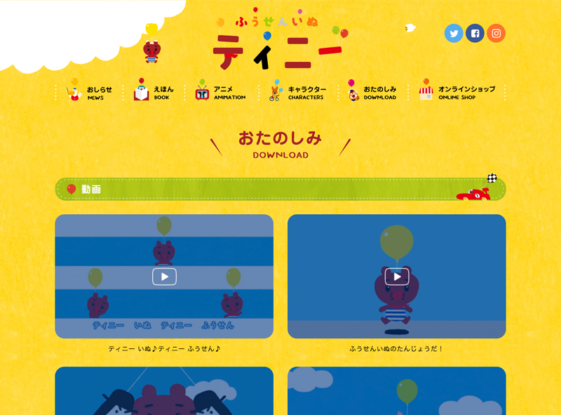 NHK Eテレで放送中の「ふうせんいぬティニー」オフィシャルサイトを制作しました。 柔らかみのあるデザインとふわふわした演出でティニーの世界観を表現しています。 たくさんいるキャラクターの紹介や、思わず目が離せなくなる動画など、楽しめるサイトになっています。